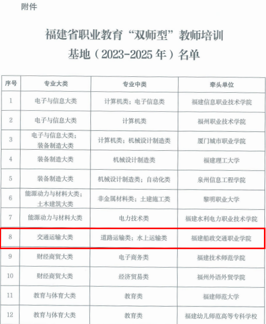 7月12日,福建省教育廳印發(fā)《關于公布省級職業(yè)教育“雙師型”教師培訓基地(2023-2025年)的通知》,我校獲批福建省職業(yè)教育“雙師型”教師培訓基地(2023-2025年),開展交通運輸大類道路運輸類、水上運輸類的“雙師型”教師培訓與實踐。福建省職業(yè)教育“雙師型”教師培訓基地是我省職業(yè)院校教師發(fā)展體系的重要組成部分,是承擔省級及以上職業(yè)院校教師素質提高計劃培訓任務的重要載體。