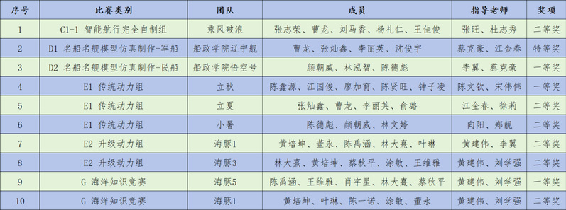在全國海洋航行器大賽賽場上,吸引著來自北京大學(xué)、上海交通大學(xué)、浙江大學(xué)、哈爾濱工業(yè)大學(xué)等371所院校和科研院所的2785支參賽隊(duì)伍,覆蓋學(xué)生超萬人。大賽圍繞創(chuàng)新創(chuàng)意創(chuàng)業(yè)、設(shè)計(jì)與制作、智慧船舶與海洋工程技術(shù)、名船名艦?zāi)P头抡嬷谱?、船模競速、帆船模型競速、海洋知識競賽七大類比賽項(xiàng)目展開角逐。我校參賽學(xué)生在此次賽事中再創(chuàng)佳績,共獲得特等獎 1 項(xiàng)、一等獎 3 項(xiàng)、二等獎 6 項(xiàng)。