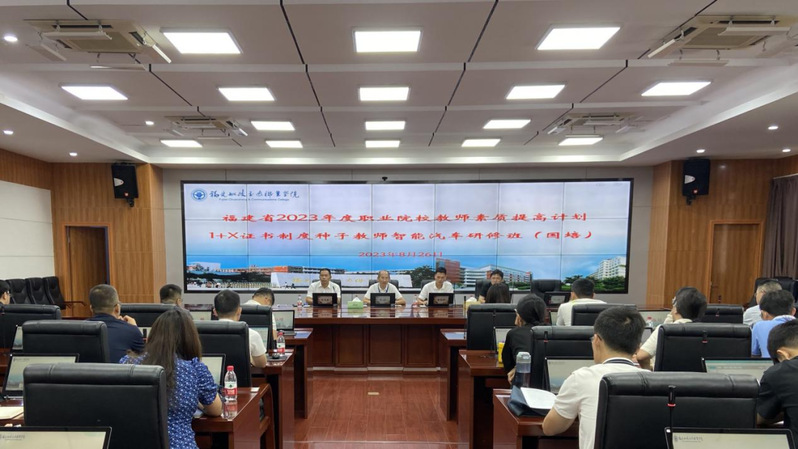 8月26日,2023年度福建省職業(yè)院校教師素質(zhì)提高計劃1+X證書制度種子教師智能汽車國培研修班在我校舉行開班儀式??萍继幚畋筇庨L出席開班儀式,汽車學(xué)院相關(guān)負責(zé)人參加。本次培訓(xùn)共有來自全省各中高職院校的39名骨干教師參加。