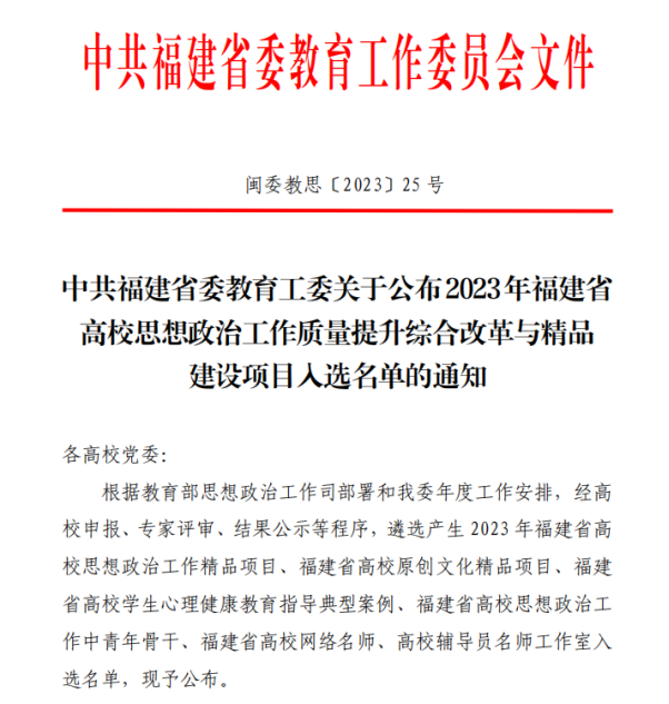 近日,中共福建省委教育工委公布了2023年福建省高校思想政治工作質(zhì)量提升綜合改革與精品建設(shè)項(xiàng)目入選名單,我院“‘四維度·五聯(lián)動(dòng)·六開心’育人育心體系探索與實(shí)踐”、原創(chuàng)話劇《赤?!?/span>2個(gè)項(xiàng)目名列其中。
