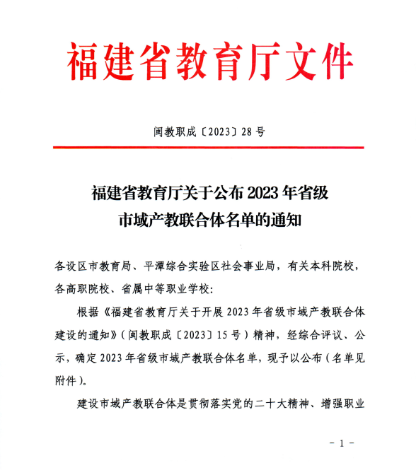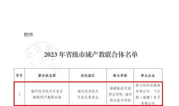 近日,福建省教育廳公布了2023年省級市域產教聯(lián)合體名單,以我院和福州職業(yè)技術學院為牽頭學校、新大陸科技集團有限公司和飛毛腿(福建)電子有限公司為牽頭企業(yè)、福州經濟技術開發(fā)區(qū)管委會為依托園區(qū)的福州經濟技術開發(fā)區(qū)物聯(lián)網產教聯(lián)合體成功入選。