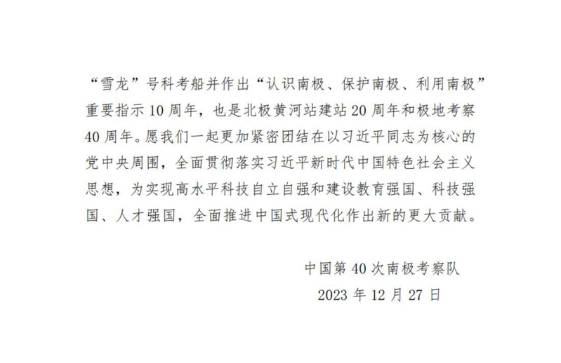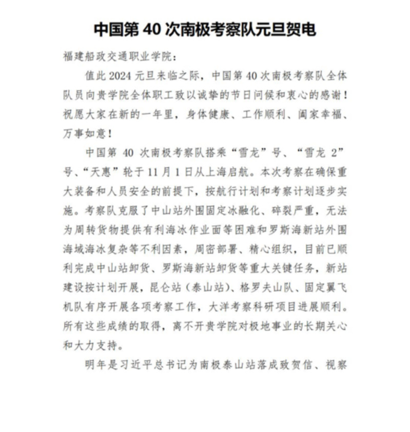 近日,我院收到中國(guó)第40次南極科學(xué)考察隊(duì)發(fā)來(lái)的元旦賀電。遠(yuǎn)在南極執(zhí)行考察任務(wù)的中國(guó)第40次南極科學(xué)考察隊(duì)全體隊(duì)員向我院全體職工致以誠(chéng)摯的節(jié)日問(wèn)候,向我院對(duì)極地事業(yè)的長(zhǎng)期支持和大力關(guān)心表示衷心的感謝。