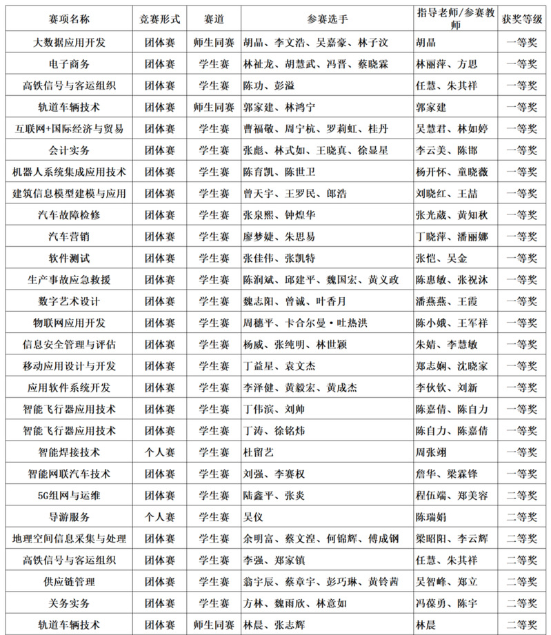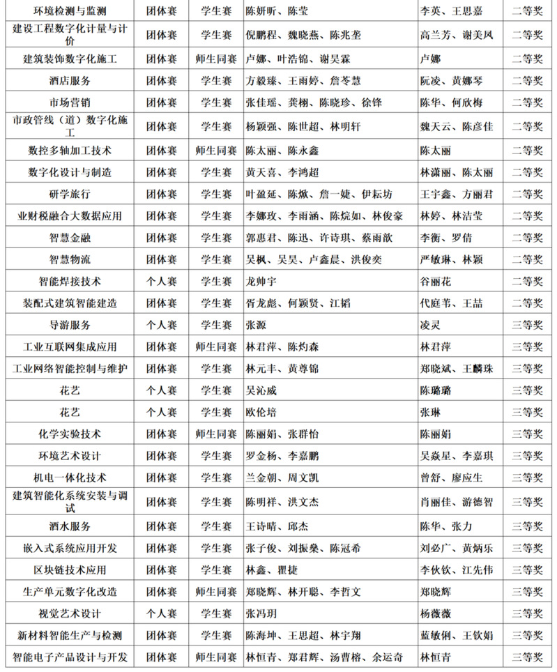 近日,由福建省教育廳、福建省人力資源和社會保障廳等八廳委共同主辦的2024年度福建省職業(yè)院校技能大賽落下序幕,我院派出178名師生組成了69支隊伍,共參加了61個賽項的角逐,共獲一等獎21項、二等獎21項、三等獎16項,其中23個賽項將代表福建省參加國賽。