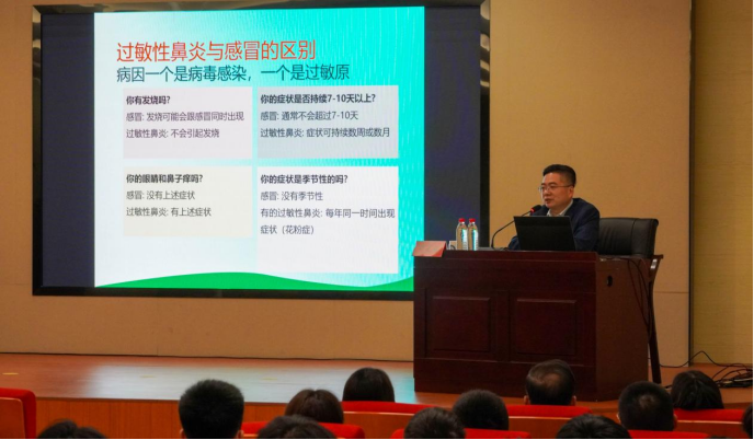 本次活動學院邀請了福建醫(yī)科大學附屬第一醫(yī)院醫(yī)學博士、著名耳鼻咽喉-頭頸外科/過敏中心主任許元騰教授進校開展《過敏三兄弟-鼻炎、哮喘與皮炎》科普知識講座。許教授以深入淺出的方式,詳細講解了過敏性鼻炎、哮喘和皮炎等常見過敏性疾病的成因、癥狀及預防方法,并強調(diào)過敏性疾病并不可怕,關鍵在于提高認識,科學防治。講座現(xiàn)場互動氣氛熱烈,師生們紛紛表示受益匪淺。