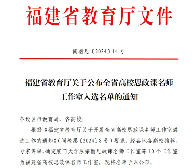 福建省高校思政課名師工作室是在福建省教育廳指導(dǎo)下,集思政課教學(xué)改革、教學(xué)研究、學(xué)術(shù)研究、理論宣講、人才培養(yǎng)等職能于一體的高校思政課教師合作共同體,是我省思政課建設(shè)領(lǐng)域的重點質(zhì)量工程。本次經(jīng)各高校申報、專家評審、結(jié)果公示等環(huán)節(jié),全省共有10個名師工作室上榜。