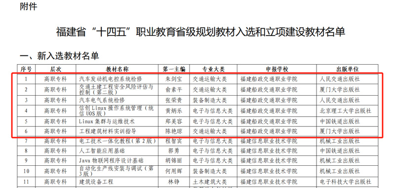 近日,福建省教育廳公布“十四五”職業(yè)教育省級(jí)規(guī)劃教材入選和立項(xiàng)建設(shè)名單。經(jīng)過(guò)單位申報(bào)、形式審查、專家評(píng)審等嚴(yán)格程序,我院19本教材在眾多參評(píng)教材中脫穎而出(其中12本“十四五”首批職業(yè)教育國(guó)家規(guī)劃教材直接入選)。這是我院在貫徹落實(shí)黨中央、國(guó)務(wù)院對(duì)教材建設(shè)的決策部署和深化教育教學(xué)改革方面取得的重要成果。