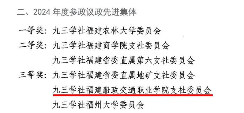 近日,九三學社福建省委員會直屬工作委員會表彰2024年度各項社務(wù)工作先進集體和先進個人,九三學社福建船政交通職業(yè)學院支社委員會榮獲2024年度參政議政先進集體三等獎,支社主委鄒澤昌、副主委陳樂天榮獲2024年度優(yōu)秀社員。