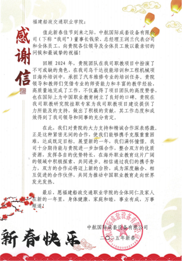 感謝信是中航國際成套設(shè)備有限公司對學(xué)院的贊許和肯定,同時(shí)也是一種鞭策。今后學(xué)院將持續(xù)加強(qiáng)與中航國際成套設(shè)備有限公司等“走出去”企業(yè)在專業(yè)建設(shè)、本土化人才培養(yǎng)、國際化職業(yè)教育標(biāo)準(zhǔn)、教學(xué)資源和裝備建設(shè)等方面的國際交流與合作,持續(xù)打造中國職教“船政模式”國際品牌,為推動中國職業(yè)教育走向世界發(fā)光發(fā)熱。