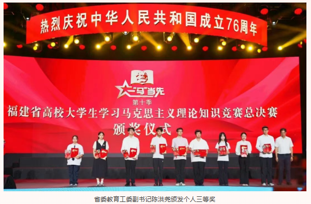 為深入學習貫徹習近平總書記關于學校思政課建設的重要指示精神,貫徹落實全國、全省教育大會精神,堅持不懈用習近平新時代中國特色社會主義思想鑄魂育人,9月27日,由中共福建省委宣傳部、中共福建省委教育工委主辦,福建省高校思想政治理論課教學指導委員會、福建教育電視臺承辦的第十季福建省高校大學生學習馬克思主義理論“一‘馬’當先”知識競賽總決賽在福建農(nóng)林大學成功舉辦。我院黨委書記陳宜大攜師生代表參與活動。