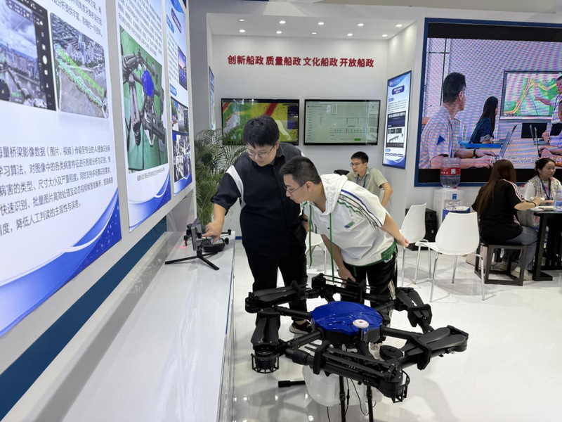 我院受邀參展并在主賓館設(shè)立展區(qū),重點展示了一系列兼具技術(shù)實力與應(yīng)用價值的成果,包括傳承船政文化的趕繒船結(jié)構(gòu)復(fù)原模型,聚焦智能裝備領(lǐng)域的 AIS 交通流分析系統(tǒng)、Ener16p 農(nóng)業(yè)植保無人機、無人機協(xié)同指揮系統(tǒng)、橋梁無人機巡檢及AI 病害識別系統(tǒng)等,豐富多元的展品吸引了眾多參會觀眾駐足咨詢、互動體驗并拍照記錄。