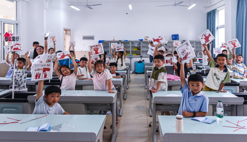 在紅色博史課堂上,英雄故事與船政歷史交相輝映,互動(dòng)分享中萌發(fā)愛國(guó)種子;在藍(lán)色致知課堂里,3D 打印筆、水果電池等趣味實(shí)驗(yàn)點(diǎn)亮科技?jí)粝耄辉诔壬勒n堂中,扎染、剪紙等沉浸式體驗(yàn)傳遞非遺溫度;在黃色動(dòng)能課堂上,互動(dòng)游戲讓孩子們?cè)趨f(xié)作中學(xué)會(huì)堅(jiān)守;在綠色匠心課堂里,茶園采茶實(shí)踐讓孩子們體悟責(zé)任擔(dān)當(dāng)。五彩課堂以多元形式,為鄉(xiāng)村孩子護(hù)航成長(zhǎng)。