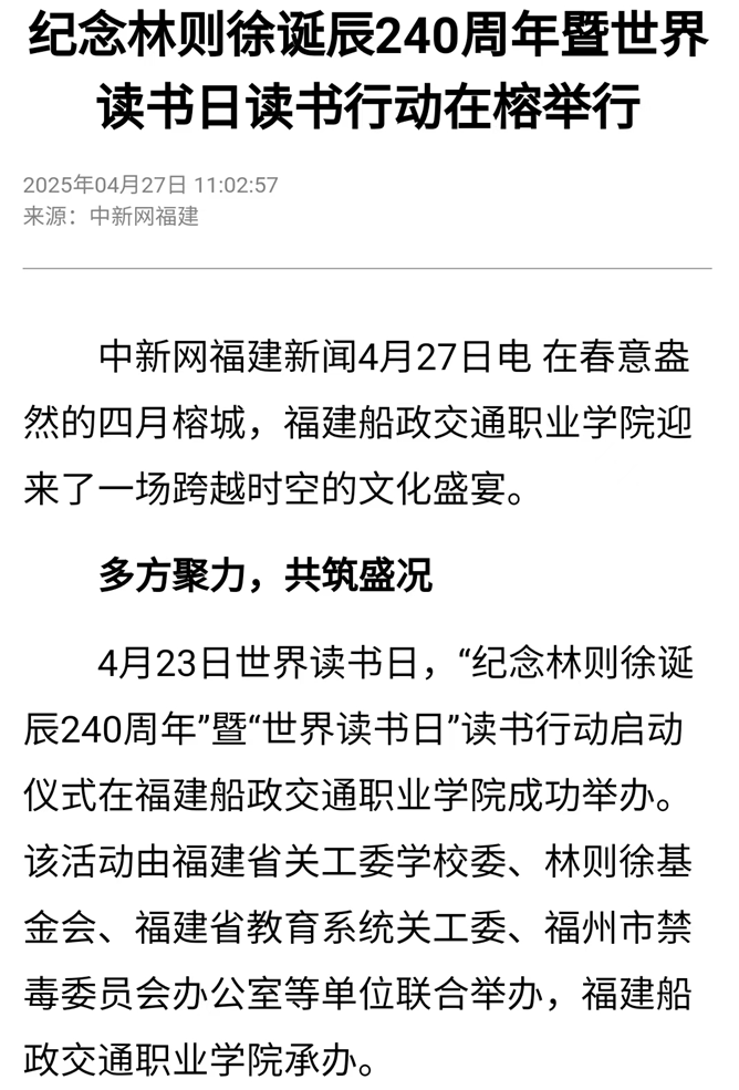 4月23日下午,在福建船政交通職業(yè)學(xué)院舉辦“紀(jì)念林則徐誕辰240周年暨世界讀書日讀書行動(dòng)啟動(dòng)儀式活動(dòng)。