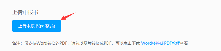 傳項目后,需要上傳項目申報書,點(diǎn)擊“上傳申報書(加蓋公章的pdf掃描件)”,(備注:僅支持Word轉(zhuǎn)換的PDF,請勿以圖片轉(zhuǎn)換成PDF,可以點(diǎn)擊下載 Word轉(zhuǎn)換成PDF教程查看),上傳項目申報書。