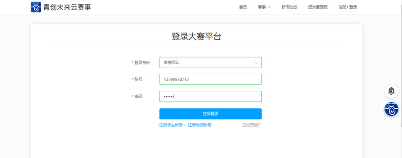 第二步:點(diǎn)擊首頁右上角“登錄”,進(jìn)入登錄頁面。選擇“參賽團(tuán)隊”身份進(jìn)行登錄。