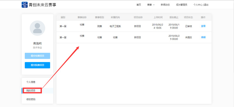 完成項目申報書上傳,完成項目創(chuàng)建,“提交”成功后,在“個人資料”——“我的項目”中可查看已上傳項目具體信息(屆別、賽事名稱、賽事級別、所屬機(jī)構(gòu)、項目名稱、上傳時間、報名截止時間以及項目狀態(tài))。