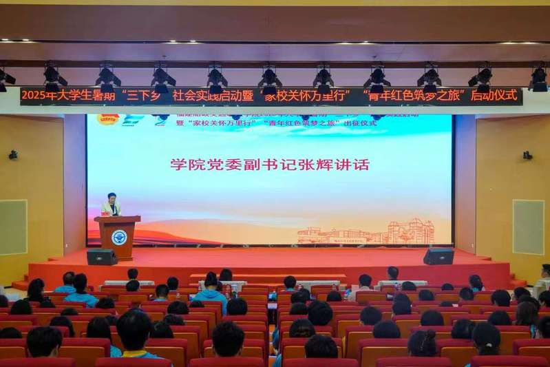 6月25日下午,福建船政交通職業(yè)學(xué)院2025年大學(xué)生暑期“三下鄉(xiāng)”社會實踐啟動暨 “家校關(guān)懷萬里行”“青年紅色筑夢之旅”出征儀式在福船園藝新樓331報告廳舉行。學(xué)院黨委副書記張輝,黨委宣傳統(tǒng)戰(zhàn)部、學(xué)生工作部、團(tuán)委、創(chuàng)新創(chuàng)業(yè)學(xué)院、馬克思主義學(xué)院等相關(guān)職能部門、二級學(xué)院,以及參加大學(xué)生暑期“三下鄉(xiāng)”社會實踐“家校關(guān)懷萬里行”“青年紅色筑夢之旅”的師生代表們參加出征儀式。儀式由學(xué)院團(tuán)委學(xué)生社團(tuán)管理部部長湯曉玲主持。