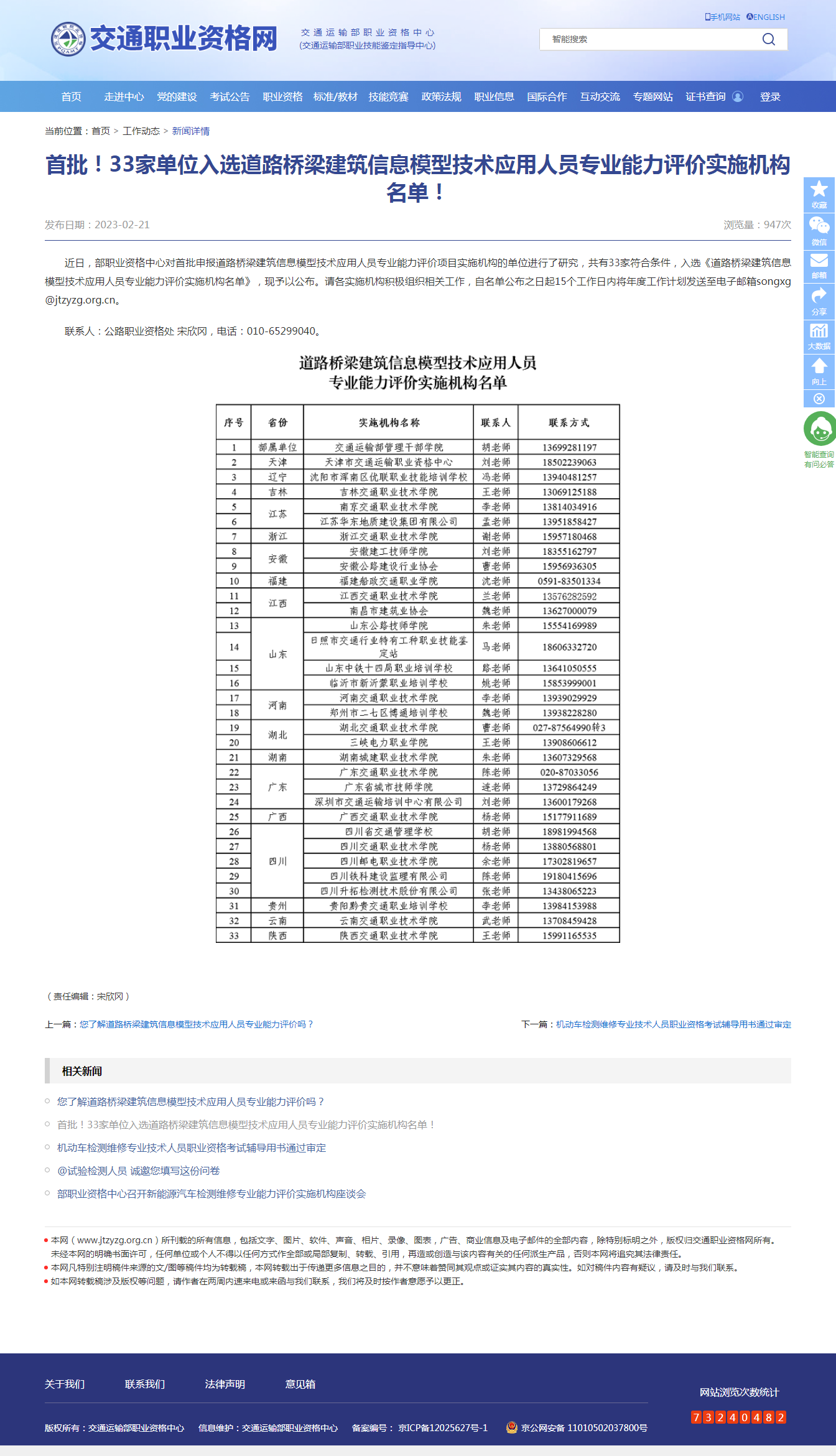 2023年2月21日,交通運(yùn)輸部職業(yè)資格中心公布了首批申報(bào)道路橋梁建筑信息模型技術(shù)應(yīng)用人員專業(yè)能力評(píng)價(jià)項(xiàng)目實(shí)施機(jī)構(gòu)名單,我院成功入選。