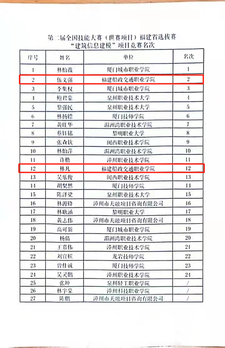 2023年3月7-9日,第二屆全國技能大賽(世賽項目)福建省選拔賽“建筑信息建模”賽項決賽在漳州職業(yè)技術(shù)學(xué)院舉行。福建省13個單位27名選手參賽。我院2名選手參賽,其中選手20級建筑工程技術(shù)3班伍文強(qiáng)同學(xué)在王喆、高巧玲、劉曉紅等BIM教師團(tuán)隊指導(dǎo)下取得了第2名的成績,斬獲一枚銀牌,實(shí)現(xiàn)該項賽事獎牌零的突破。伍文強(qiáng)同學(xué)榮獲“福建省技能能手”稱號和建筑信息模型技術(shù)員“技師”資格,并有機(jī)會晉級國賽。另一名選手20級建筑工程技術(shù)1班林凡同學(xué)榮獲本項賽事的第12名。