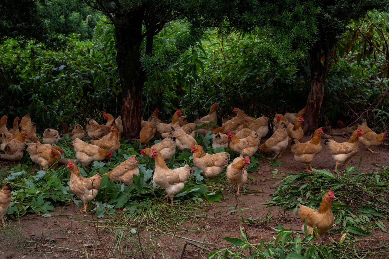 據介紹,這里曾經是寸草不生、水土流失嚴重的稀土礦廢棄場。2006年,雞場創(chuàng)辦人藍曉紅承包村里的500畝荒山,開始了“種樹+養(yǎng)雞”的綠色生態(tài)雞場建設事業(yè)。此后的日子在“種樹—養(yǎng)雞—賣雞苗—種樹”中循環(huán)往復,藍曉紅在銷售雞苗過程中,每到一地都要帶回不少樹苗。多年來,她種下桂花、油茶、毛竹、紅豆杉等苗木1萬余株,終于將這里變成了綠樹成蔭、雞鳥爭鳴的美麗綠洲。水土生態(tài)的改善也為河田雞的養(yǎng)殖提供了天然場所。雞奔走綠林山間,食百草飛蟲,飲山泉溪水,成為了營養(yǎng)豐富、口感緊實的世界名雞。而雞的雞糞又為林子提供了養(yǎng)料,儼然形成了一種共生共存的可持續(xù)發(fā)展模式。
