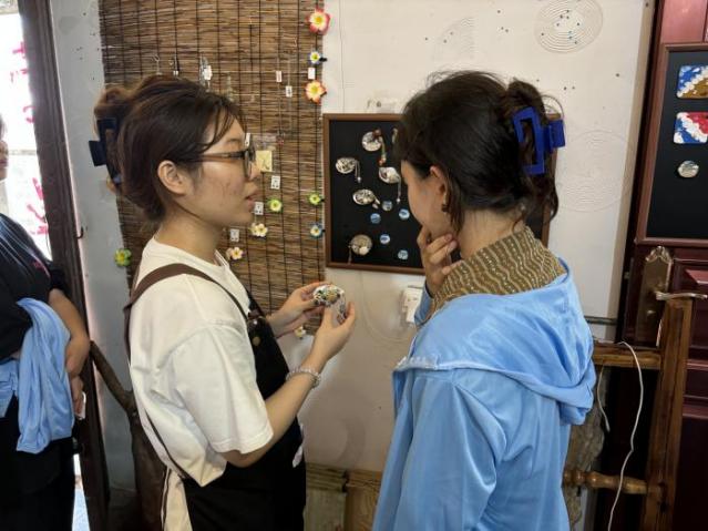 文創(chuàng)工坊內(nèi),貝殼拼貼的平潭海景圖與臺(tái)灣阿里山風(fēng)光圖并列陳列,別具一格的創(chuàng)意設(shè)計(jì)吸引不少游客駐足觀賞。店員介紹:“通過(guò)融合臺(tái)灣玻璃工藝與平潭貝殼資源開(kāi)發(fā)的石厝主題擺件較受歡迎?!痹诘陠T的講解演示后,隊(duì)員們動(dòng)手參與文創(chuàng)設(shè)計(jì),親手制作“兩岸同心”主題掛件。