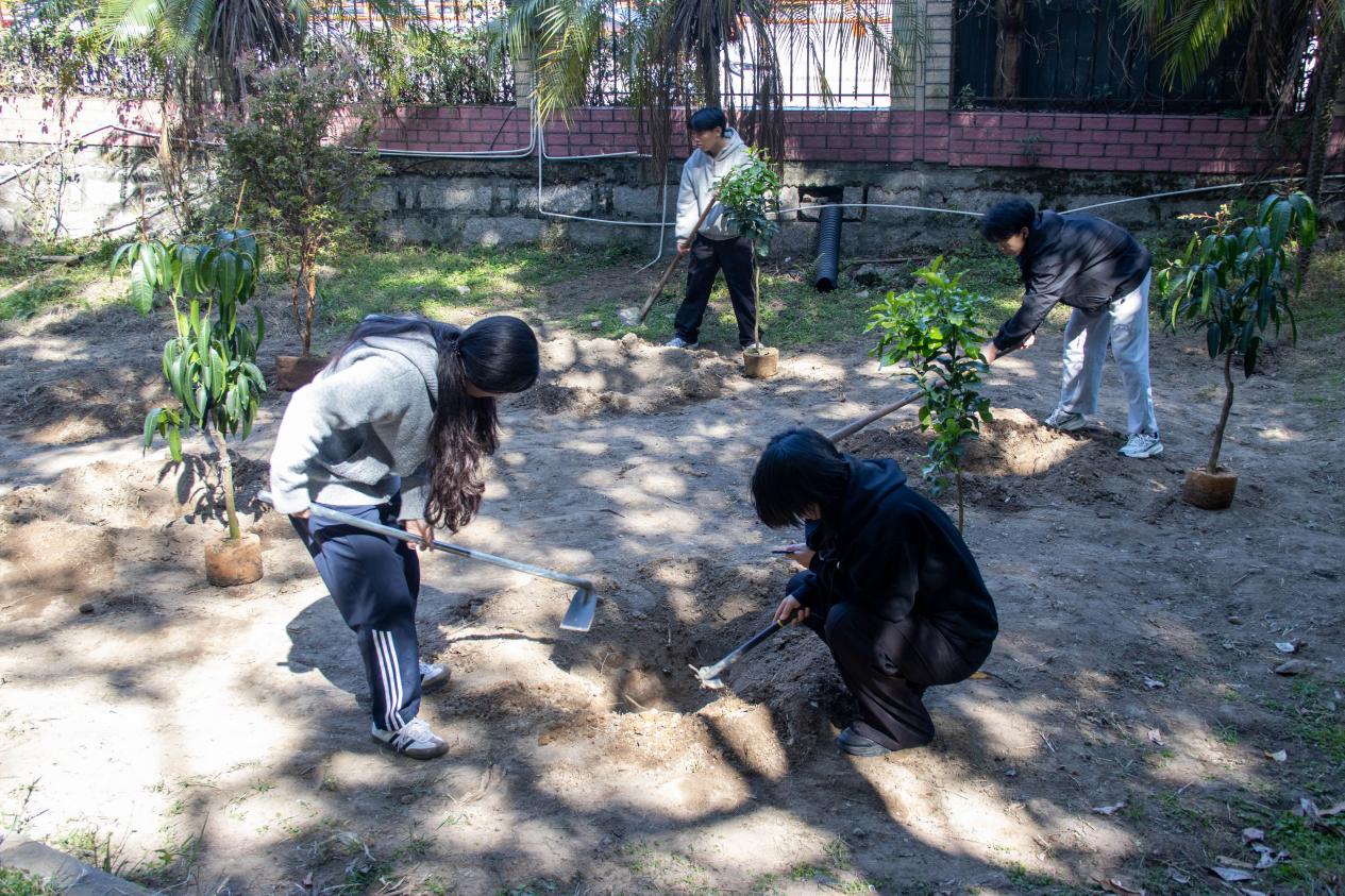 植樹現(xiàn)場,熱火朝天。老師和同學(xué)們手持鐵鍬、水桶,分工協(xié)作,干勁十足。挖坑、扶苗、培土、澆水……同學(xué)們揮汗如雨,數(shù)株帶著美好寓意的樹苗便“安家落戶”——象征甜蜜生活的樹葡萄、散發(fā)清香的檸檬樹、期待盛夏佳果的荔枝和芒果樹,在春風(fēng)中輕輕搖曳,為校園增添了片片新綠和無限憧憬。