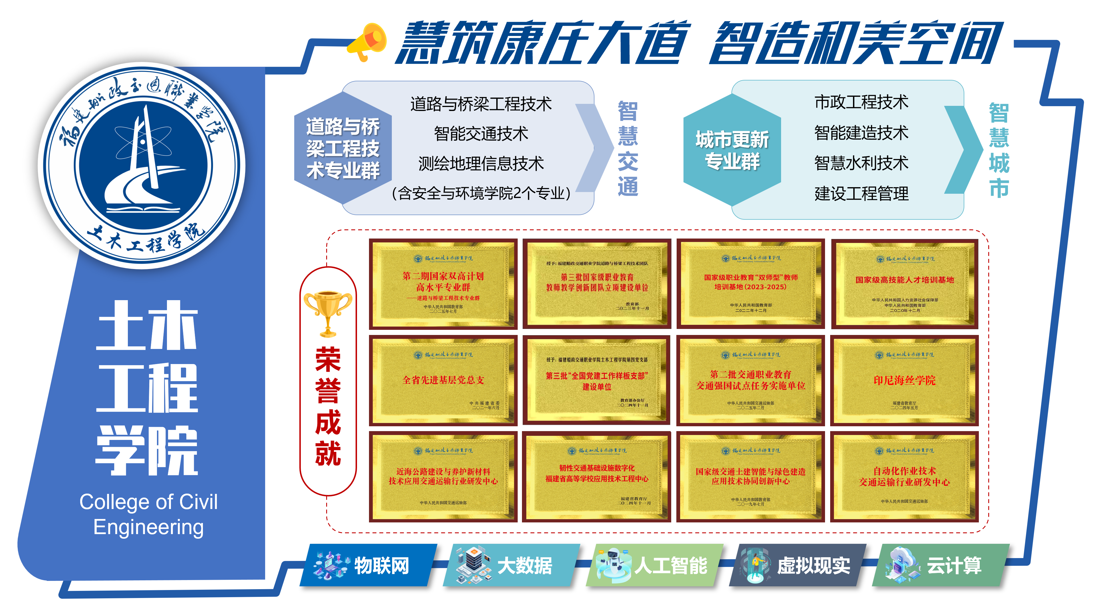 土木工程學院是全省重要的交通工程建設與管理高技能人才培養(yǎng)基地,道路與橋梁工程技術專業(yè)群入選第二期國家雙高計劃高水平專業(yè)群。現有國家級職業(yè)教育教師創(chuàng)新團隊、國家級交通土建智能與綠色建造應用技術協(xié)同創(chuàng)新中心、國家級職業(yè)教育“雙師型”教師培訓基地、國家高等職業(yè)院校創(chuàng)新行動計劃校企共建生產性實訓基地、交通部自動化作業(yè)技術交通運輸行業(yè)研發(fā)中心、交通部近海公路建設與養(yǎng)護新材料技術應用交通運輸行業(yè)研發(fā)中心,以及韌性交通基礎設施數字化福建省高等學校應用技術工程中心,承擔交通運輸部第二批交通職業(yè)教育交通強國專業(yè)試點任務。自1974年開辦以來,已為行業(yè)輸送超2萬名交通土建類相關專業(yè)畢業(yè)生,為服務交通強國戰(zhàn)略,加快建設交通強國福建先行區(qū),推動福建建設交通強省、構建海峽兩岸融合發(fā)展示范區(qū)和全國首批公路數字化轉型升級示范區(qū)提供人才支撐。