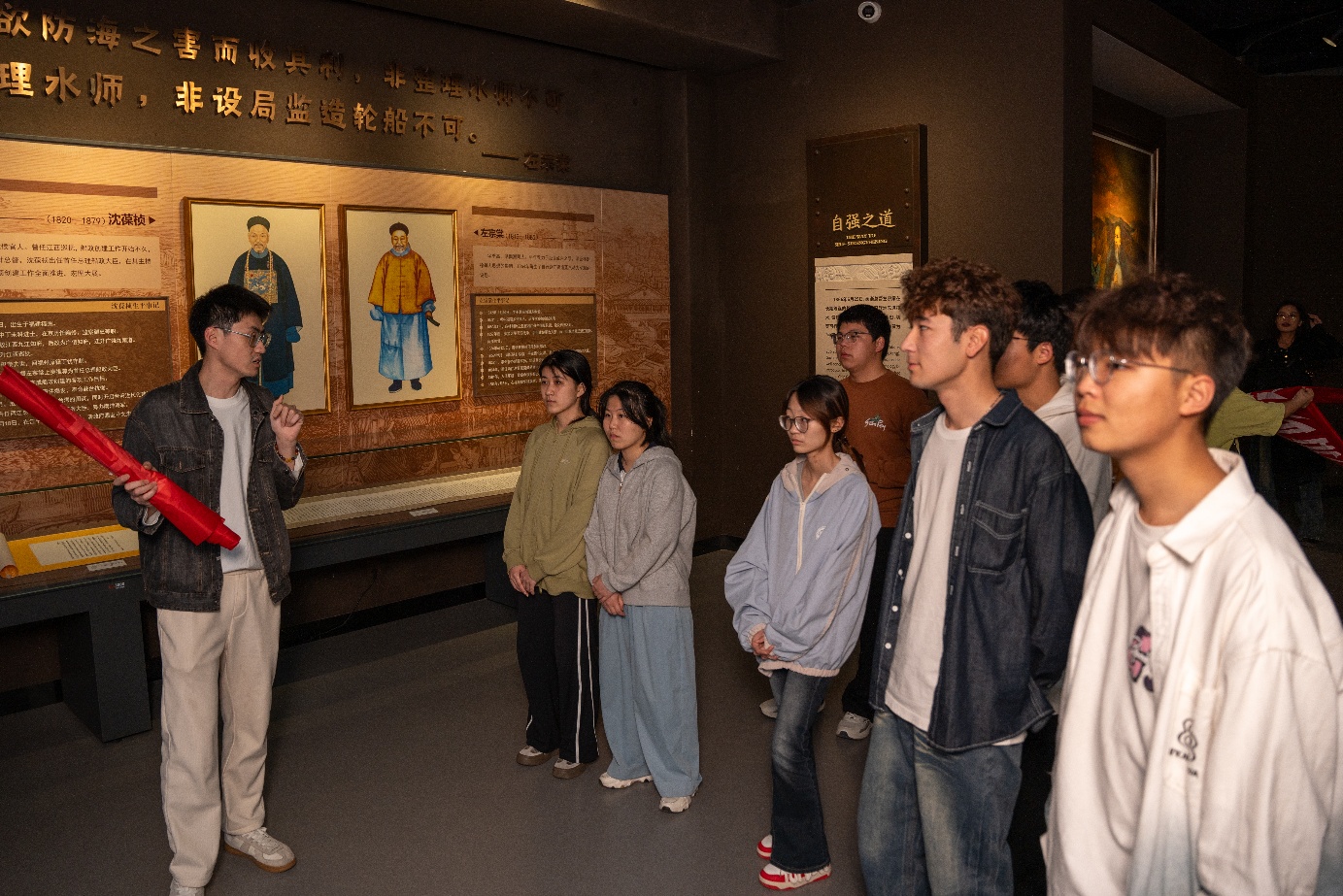 活動(dòng)現(xiàn)場(chǎng),同學(xué)們參觀各大主題展區(qū),系統(tǒng)了解船政創(chuàng)辦背景、近代船舶工業(yè)發(fā)展與海防建設(shè)的艱辛歷程。那些泛黃的老照片與斑駁的實(shí)物展品,正無聲地訴說著一段跨越百年的故事。大家認(rèn)真聆聽講解、駐足觀看展品,各民族同學(xué)邊走邊交流心得,在輕松融洽的氛圍里相互了解、彼此靠近,真切感受到先輩們?yōu)閲?guó)擔(dān)當(dāng)、開拓進(jìn)取的精神力量。