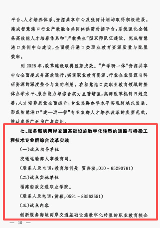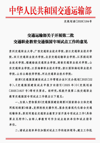 近日,交通運(yùn)輸部正式印發(fā)《關(guān)于開展第二批交通職業(yè)教育交通強(qiáng)國(guó)專項(xiàng)試點(diǎn)工作的意見》(交規(guī)劃函〔2026〕184號(hào)),公布第二批交通職業(yè)教育交通強(qiáng)國(guó)專項(xiàng)試點(diǎn)任務(wù)名單,我校《服務(wù)海峽兩岸交通基礎(chǔ)設(shè)施數(shù)字化轉(zhuǎn)型的道路與橋梁工程技術(shù)專業(yè)群綜合改革實(shí)踐》項(xiàng)目成功入選。