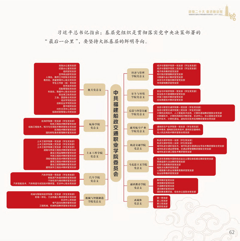 十九大以來,福建船政交通職業(yè)學(xué)院堅持以習(xí)近平新時代中國特色社會主義思想為指導(dǎo),堅持社會主義辦學(xué)方向,深入貫徹黨的十九大和十九屆歷次全會精神,堅守“為黨育人、為國育才”的初心和使命,慎終如始推進學(xué)校黨的政治建設(shè)、思想建設(shè)、組織建設(shè)、作風(fēng)建設(shè)、紀律建設(shè)、制度建設(shè),黨的組織體系和學(xué)校治理體系相得益彰,黨建引領(lǐng)推動創(chuàng)新船政、質(zhì)量船政、文化船政協(xié)奏齊鳴,政治生態(tài)、學(xué)術(shù)生態(tài)、文化生態(tài)持續(xù)向好,辦學(xué)效率、辦學(xué)效能、辦學(xué)效益顯著提升!