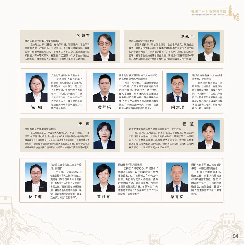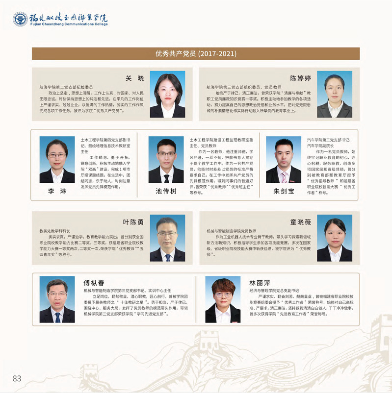 十九大以來,福建船政交通職業(yè)學(xué)院堅持以習(xí)近平新時代中國特色社會主義思想為指導(dǎo),堅持社會主義辦學(xué)方向,深入貫徹黨的十九大和十九屆歷次全會精神,堅守“為黨育人、為國育才”的初心和使命,慎終如始推進學(xué)校黨的政治建設(shè)、思想建設(shè)、組織建設(shè)、作風(fēng)建設(shè)、紀(jì)律建設(shè)、制度建設(shè),黨的組織體系和學(xué)校治理體系相得益彰,黨建引領(lǐng)推動創(chuàng)新船政、質(zhì)量船政、文化船政協(xié)奏齊鳴,政治生態(tài)、學(xué)術(shù)生態(tài)、文化生態(tài)持續(xù)向好,辦學(xué)效率、辦學(xué)效能、辦學(xué)效益顯著提升! 近期,學(xué)校官微將陸續(xù)推出“學(xué)校黨建思政成果巡禮(2017-2022)”專題系列,邀請您共同回顧學(xué)校過去五年黨建思政工作的發(fā)展歷程。 感召榜樣力量