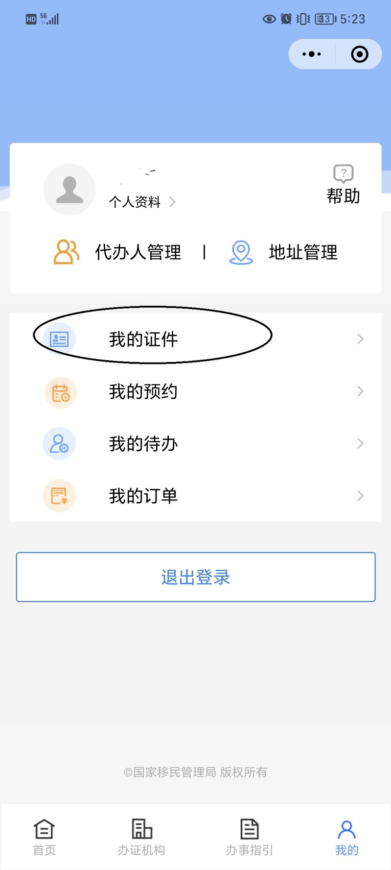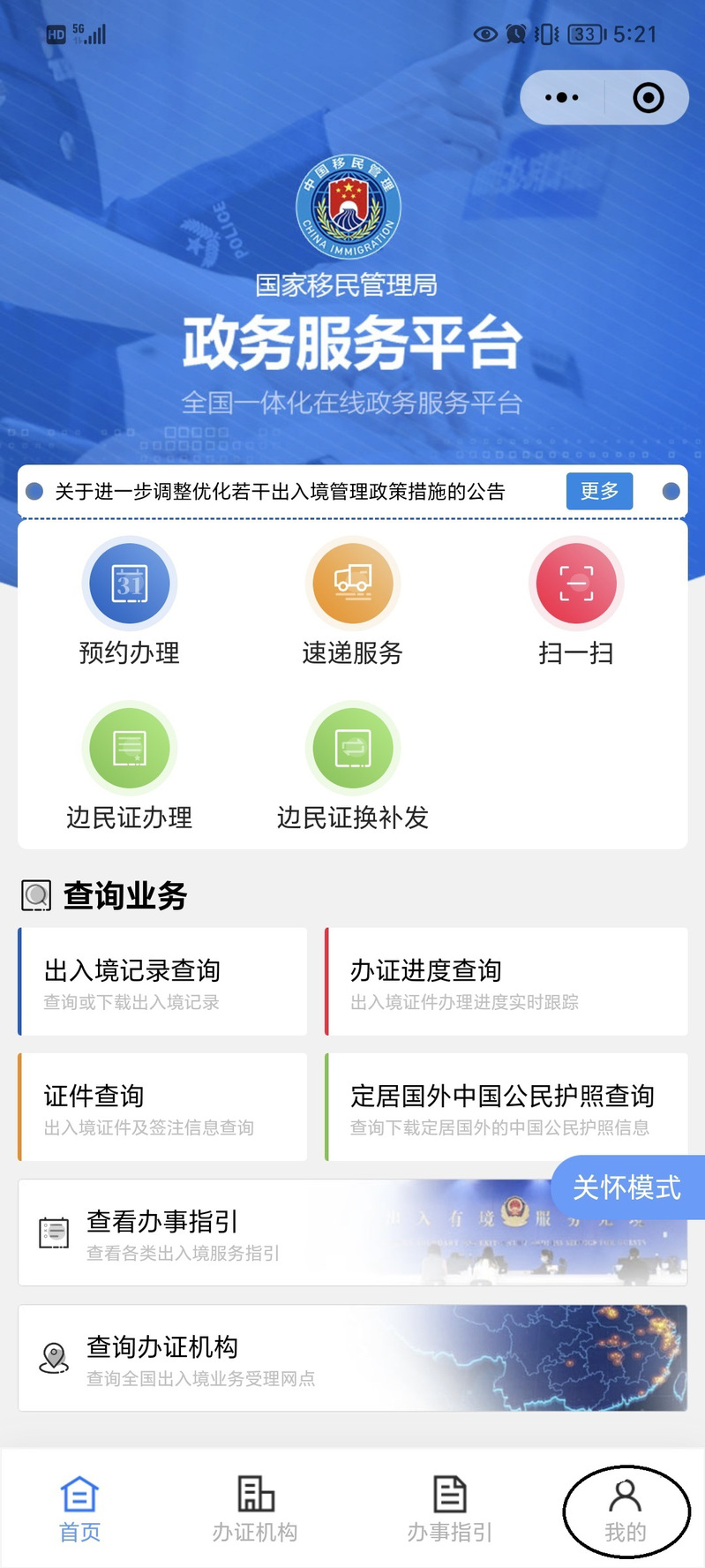 進(jìn)入“移民局”小程序后,點(diǎn)擊右下角“我的”。