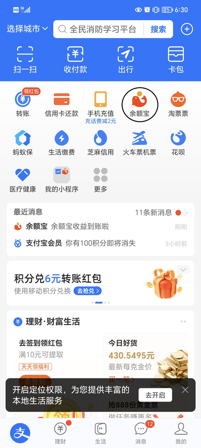 打開支付寶首頁,點(diǎn)擊“余額寶”。
