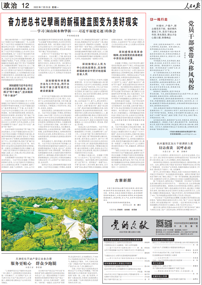今天,人民日報刊發(fā)文章《奮力把總書記擘畫的新福建藍圖變?yōu)槊篮矛F(xiàn)實——學習<閩山閩水物華新——習近平福建足跡>的體會》,全文如下: