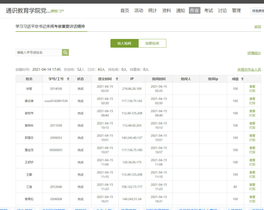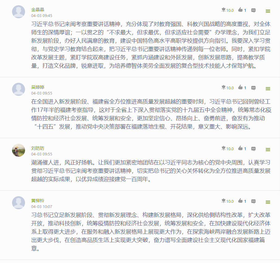 通識教育學(xué)院黨總支創(chuàng)新黨史學(xué)習(xí)教育形式,利用“學(xué)習(xí)通”線上黨建平臺的討論和作業(yè)等模塊,開展黨史學(xué)習(xí)教育,以及黨史和習(xí)近平總書記來閩考察重要講話精神應(yīng)知應(yīng)會線上測試,增強學(xué)習(xí)實效。同時,每日在網(wǎng)頁和微信公眾號上推送“黨史上的今天”和黨史學(xué)習(xí)相關(guān)內(nèi)容,通報總支黨員前日總支“學(xué)習(xí)強國”積分情況,督促每位教師認(rèn)真學(xué)習(xí)。