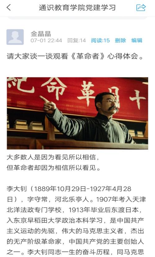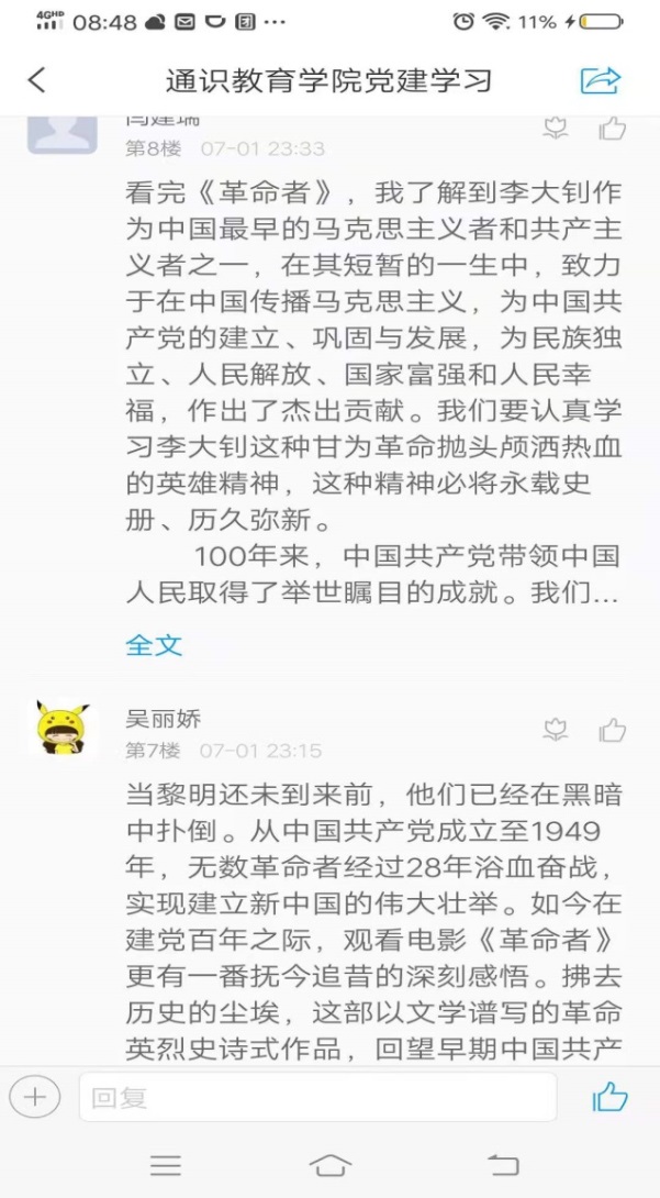 歷史川流不息,精神代代相傳。在觀影結(jié)束后各黨員通過(guò)“學(xué)習(xí)通”-“通識(shí)教育學(xué)院黨總支”-“討論”-“觀看黨建電影《革命者》,撰寫心得體會(huì)”,通過(guò)觀看紅色電影《革命者》,師生黨員深刻感受到中國(guó)共產(chǎn)黨先驅(qū)們偉大的建黨精神,在奮斗中堅(jiān)持真理、堅(jiān)守理想,踐行初心、擔(dān)當(dāng)使命,不怕犧牲、英勇斗爭(zhēng),對(duì)黨忠誠(chéng)、不負(fù)人民,大家紛紛表示要繼續(xù)弘揚(yáng)光榮傳統(tǒng)、賡續(xù)紅色血脈,永遠(yuǎn)把偉大建黨精神繼承下去、發(fā)揚(yáng)光大。