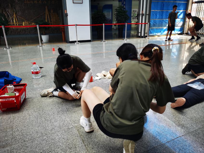 “頭部包扎”、“小腿包扎”、“胸部包扎”、“手臂骨折固定”、“小腿骨折固定”、“心肺復(fù)蘇”、“匍匐搬運(yùn)傷員”、“掮法搬運(yùn)傷員”,經(jīng)過了參賽隊(duì)員們一次次艱苦的訓(xùn)練,才有了他們齊心協(xié)力的表現(xiàn)。