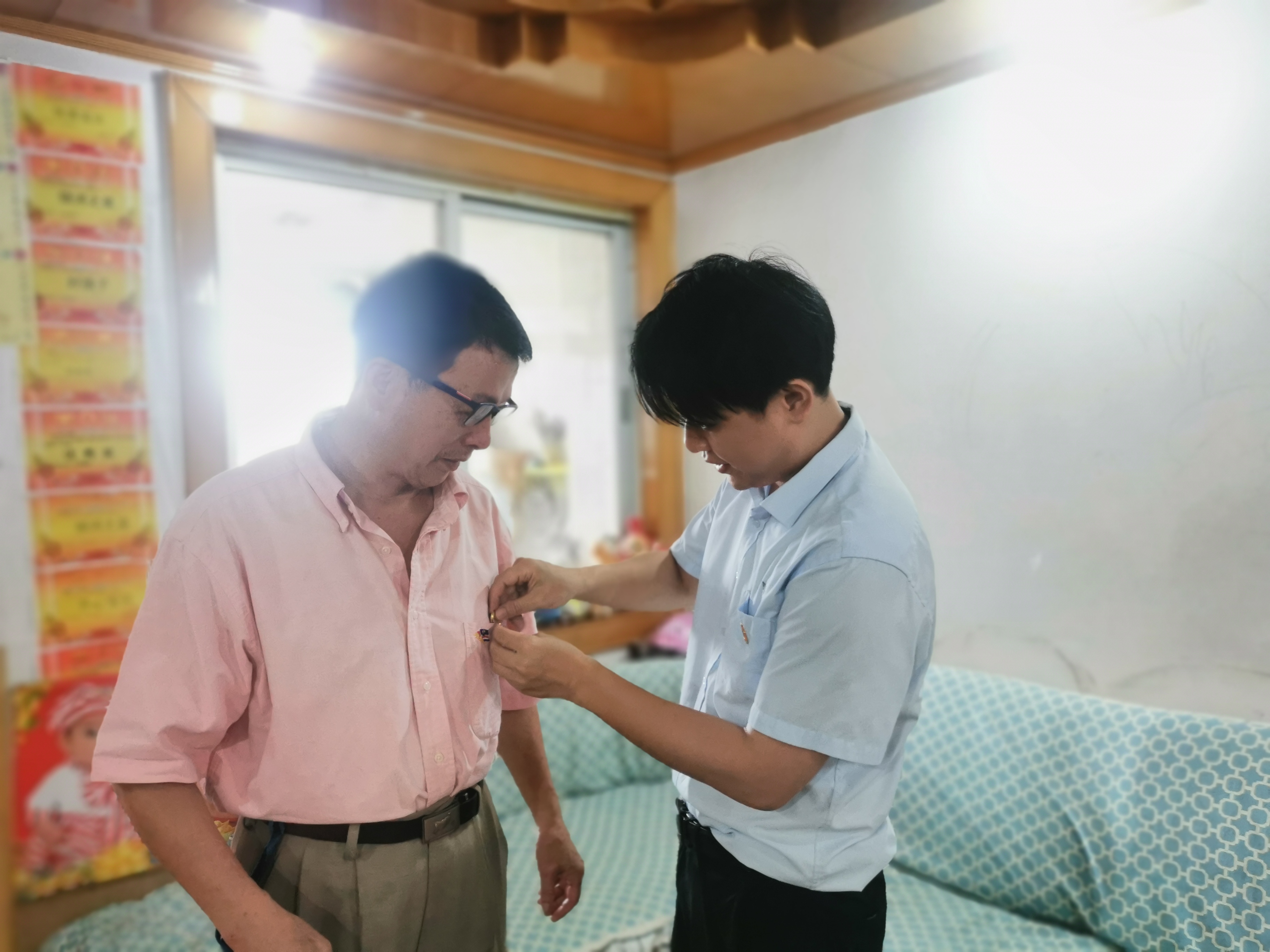 老黨員陳于東精神矍鑠、思維敏捷、積極傳播正能量。金晶晶和劉淋送上祝福和慰問品,祝陳于東老師健康長壽、闔家幸福,希望他始終保持優(yōu)良作風,不忘初心、牢記使命,繼續(xù)為黨奉獻力量,為學院發(fā)展作出貢獻。