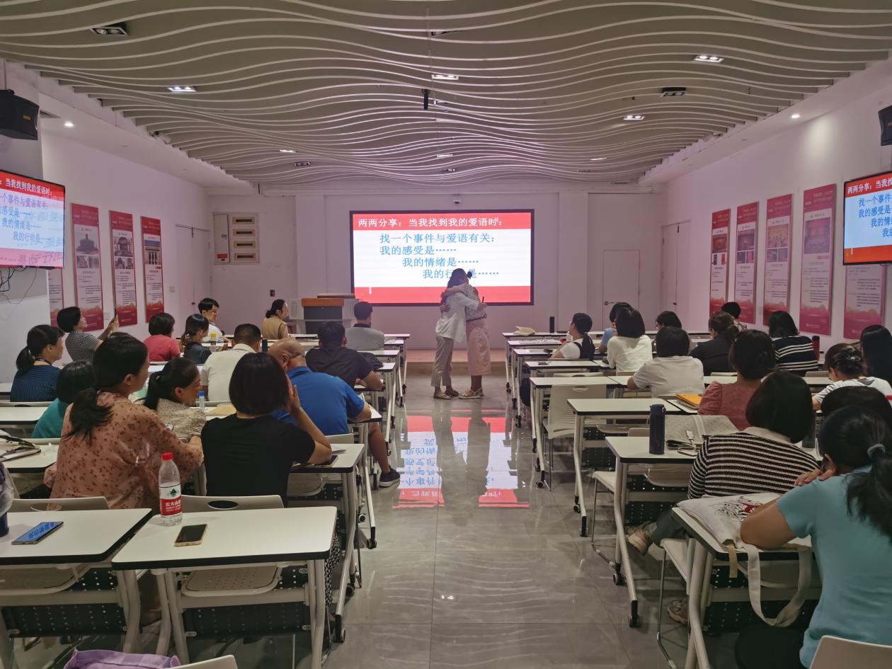 課上,李榕輝老師從教師心理健康出發(fā),結(jié)合生動(dòng)的案例和自身經(jīng)歷,介紹家庭親子溝通的重要性、意義和途徑,重點(diǎn)闡述了肯定的言詞、精心的時(shí)刻、接受禮物、服務(wù)的行動(dòng)和身體的接觸等“愛的五種語言”,以及具體表達(dá)方式?,F(xiàn)場氣氛活躍,李榕輝開展多次互動(dòng)游戲、測試、冥想母愛之光等活動(dòng),有效教師們打開良好溝通之門,提高與家人溝通的質(zhì)量。老師們紛紛表示,培訓(xùn)課氛圍感好,實(shí)用性強(qiáng),工作離不開家庭,離不開良好的親子關(guān)系,從培訓(xùn)課中學(xué)會(huì)了實(shí)用親子表達(dá)溝通的方式和技巧。