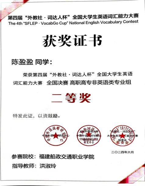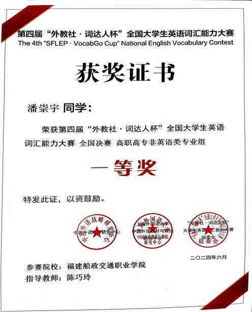 中國外語戰(zhàn)略研究中心、中國外語教材與教法研究中心和上海外語教育出版社于2024年3月-5月聯(lián)合啟動了第四屆“外教社·詞達人杯”全國大學(xué)生英語詞匯能力大賽。我校共有547名選手報名參賽,其中54位選手晉級省賽。其中,4月16日舉行的省賽中。我校4位選手分別獲得省一、二、三等獎,潘崇宇和陳瑩瑩同學(xué)代表我校參加了5月25日舉行的全國總決賽并分別獲得全國決賽一、二等獎。