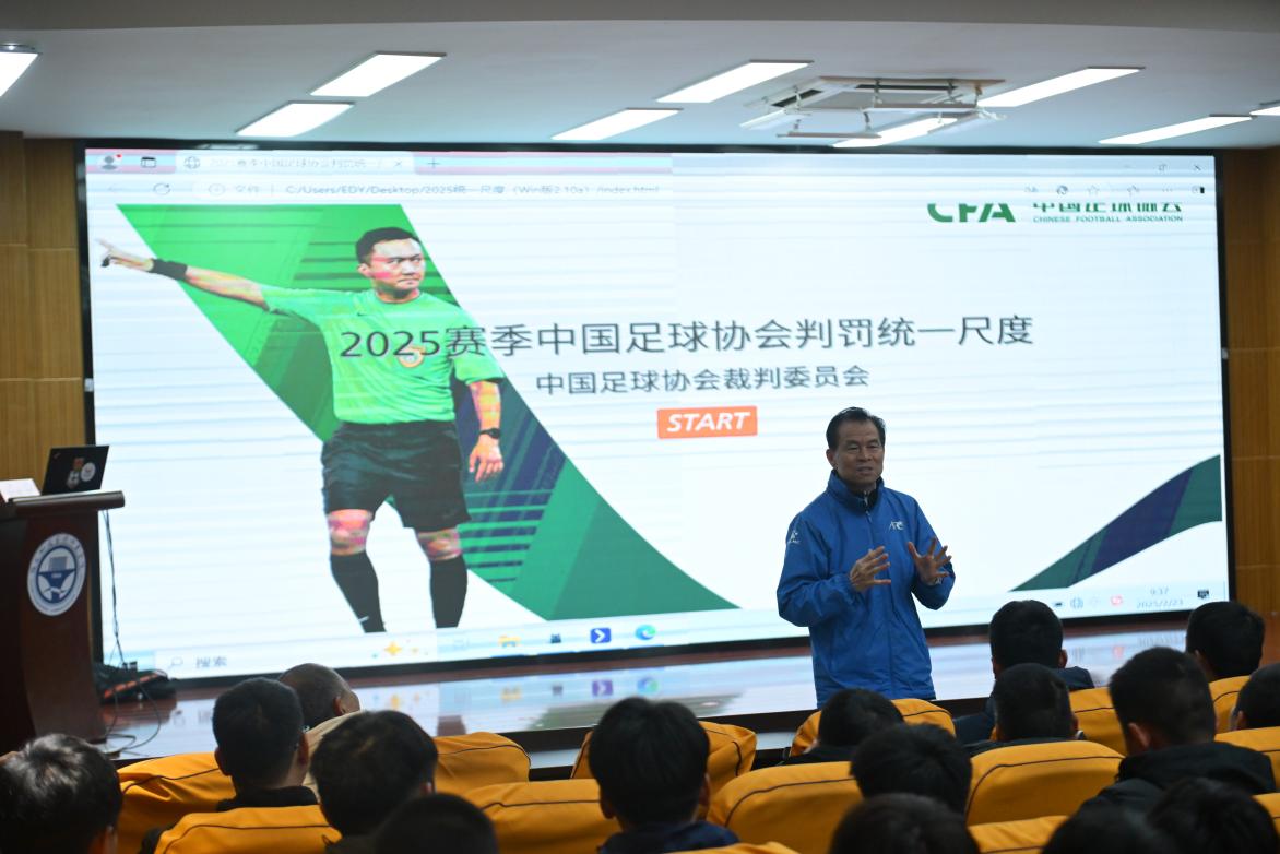 開幕式后國際足聯(lián)、亞足聯(lián)、中國足協(xié)講師,前亞洲金旗劉鐵軍老師為全體學員講解2025中國足協(xié)各級比賽統(tǒng)一尺度,劉鐵軍老師理論與視頻相結合,為學員們解疑答惑。下午全體裁判員在實踐課講師王長其、王發(fā)振、溫從明、程偉的帶領下,進行了裁判員跑位和助理裁判員旗示練習。