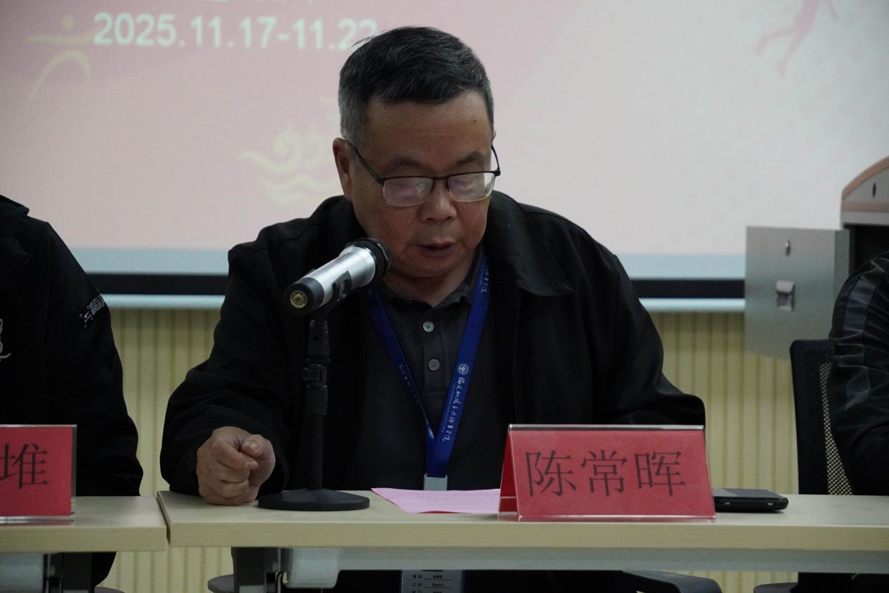 第一階段議程中,陳常暉副院長代表學校致歡迎辭,對與會領導、嘉賓及各參賽隊伍表示熱烈歡迎。他介紹了我校作為國家示范性高職院校和“雙高計劃”建設單位的辦學成果,并介紹了我校“以體育德、以賽育人、專技相長”的體育育人理念,致力于將體育精神融入人才培養(yǎng)全過程。陳副院長表示,學校高度重視本次賽事協(xié)辦工作,已組建專項工作組,全面做好場地維護、后勤保障與安全服務,全力營造公平、安全、舒適的競賽環(huán)境。他期待各參賽隊伍恪守體育道德,尊重規(guī)則、尊重對手、尊重裁判,展現(xiàn)當代大學生的良好精神風貌。