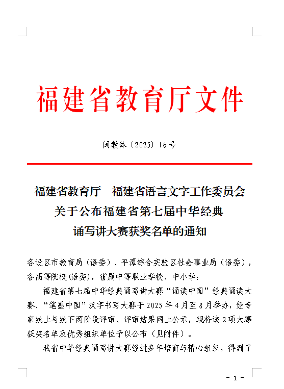 近日,福建省教育廳、福建省語(yǔ)言文字工作委員會(huì)聯(lián)合公布了福建省第七屆中華經(jīng)典誦寫(xiě)講大賽獲獎(jiǎng)名單,由我校教師吳婷婷、于曉凌共同指導(dǎo)24級(jí)汽車(chē)學(xué)院汽車(chē)制造與試驗(yàn)技術(shù)(3+2)1班葉文濤的朗誦作品《大堰河——我的保姆》(節(jié)選)表現(xiàn)優(yōu)異,榮獲職業(yè)院校學(xué)生組省一等獎(jiǎng),并獲得該比賽國(guó)賽的入場(chǎng)券。