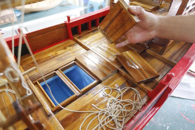 “這是大船縮小到十分之一的樣子,看著小,卻堪比現(xiàn)代的房車,廚房、客廳、臥室、廁所一應(yīng)俱全!”江金春掀開甲板,露出10個隔艙,每個都是獨立、互不透水的。他說,這是福船的“水密隔艙”建造技藝,已列入聯(lián)合國教科文組織急需保護的非物質(zhì)文化遺產(chǎn)名錄。