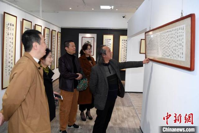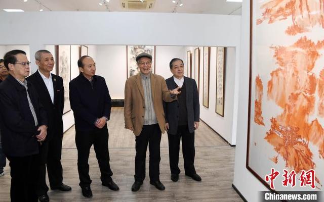 著名藝術家沈巖先生(右二)向來賓介紹在館內展出、由他本人創(chuàng)作的80多幅書畫作品。