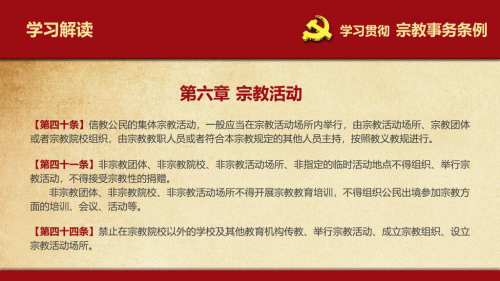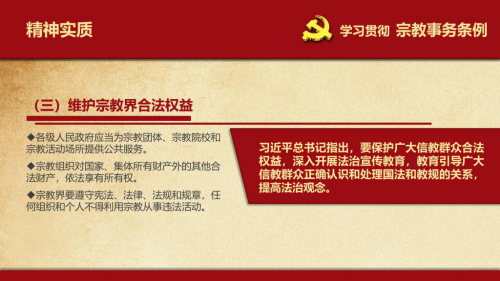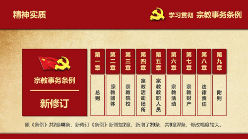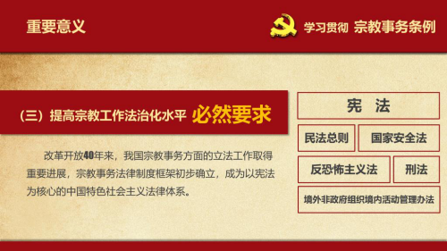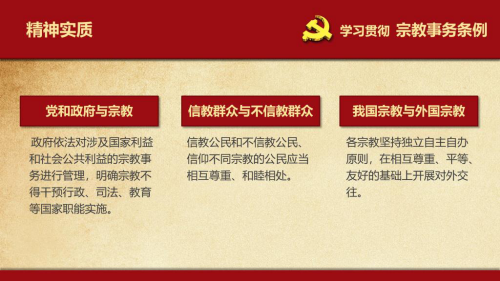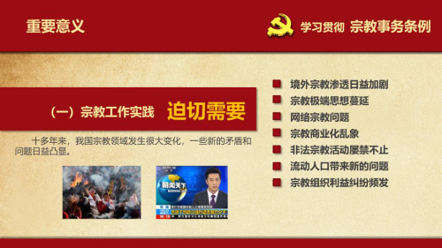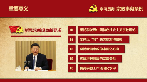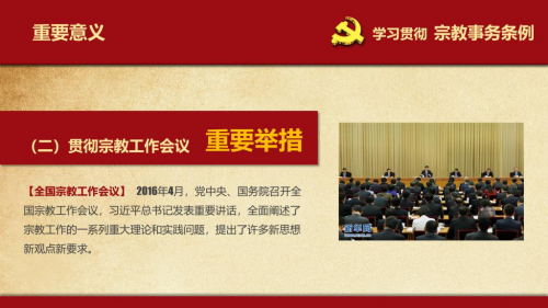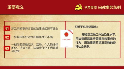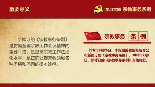 黨的十八大以來,以習(xí)近平同志為核心的黨中央高度重視宗教工作,將宗教工作擺上更加重要的議事日程。2016年,黨中央、國務(wù)院召開全國宗教工作會議,習(xí)近平總書記發(fā)表了重要講話,從黨和國家事業(yè)發(fā)展全局的戰(zhàn)略高度,科學(xué)分析了宗教工作面臨的形勢和任務(wù),就宗教問題和宗教工作提出了一系列新思想新觀點(diǎn)新要求,為加強(qiáng)和改進(jìn)新形勢下的宗教工作指明了方向、提供了遵循。 新修訂的《宗教事務(wù)條例》于2018年2月1日正式實(shí)施。出臺新修訂的《條例》,是貫徹全國宗教工作會議精神的重要舉措,對推進(jìn)我國宗教工作法治化進(jìn)程具有十分重要的意義。