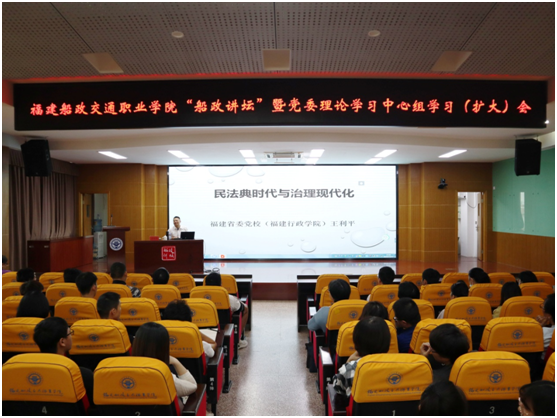 中國教育在線訊 10月15日,學(xué)院舉辦“船政講壇”暨黨委理論學(xué)習(xí)中心組學(xué)習(xí)(擴(kuò)大)會,特邀福建自貿(mào)試驗(yàn)區(qū)研究院執(zhí)行院長、省委黨校法學(xué)教研部副教授王利平作題為《民法典時(shí)代和治理現(xiàn)代化》專題輔導(dǎo)講座,黨委理論學(xué)習(xí)中心組成員、副科級以上干部、各黨總支、輔導(dǎo)員、馬克思主義學(xué)院全體教師,部分學(xué)生等200余人參加。