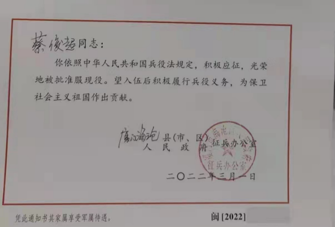 2022年1月,即將大學(xué)畢業(yè)的他毅然決定再次報(bào)名應(yīng)征,決定畢業(yè)季二次入伍,再續(xù)軍旅情緣,用自己的實(shí)際行動(dòng)續(xù)寫保家衛(wèi)國的榮光。