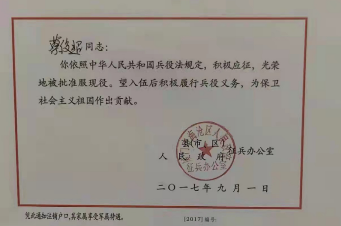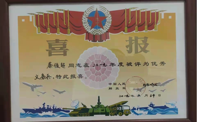 在第一次入伍期間,他對自己嚴(yán)格要求,憑借著自己強(qiáng)大的毅力和好強(qiáng)的性格,刻苦訓(xùn)練,很快在隊(duì)伍中脫穎而出,榮獲“優(yōu)秀義務(wù)兵”稱號(hào)。