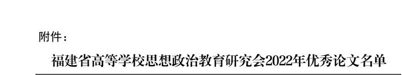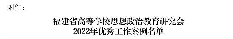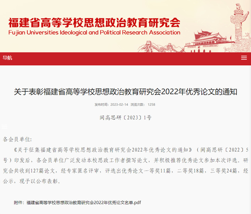 日前,福建省高等學校思想政治教育研究會公布了2022年優(yōu)秀論文和優(yōu)秀工作案例結果,我校獲得優(yōu)秀論文二等獎1項,優(yōu)秀工作案例三等獎1項。