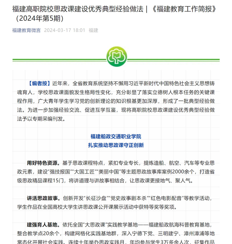 【編者按】近年來,全省教育系統(tǒng)堅持不懈用習近平新時代中國特色社會主義思想鑄魂育人,學校思政課面貌發(fā)生格局性變化,充分彰顯了落實立德樹人根本任務的關(guān)鍵課程作用,廣大青年學生學習黨的創(chuàng)新理論的知識根基更加深厚,形成了一批典型經(jīng)驗做法。為進一步加強經(jīng)驗交流、促進互學互鑒,現(xiàn)將高職院校思政課建設優(yōu)秀典型經(jīng)驗做法予以專期采編刊發(fā)。